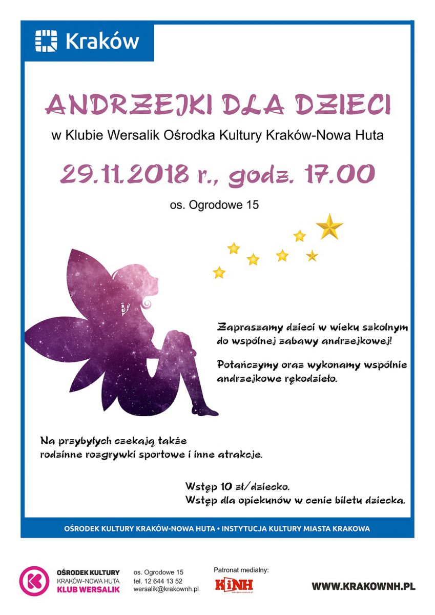 Klub Wersalik Oœrodka Kultury Kraków-Nowa Huta (os. Ogrodowe 15) zaprasza 29 listopada o godz. 17.00 dzieci w wieku szkolnym do wspólnej zabawy andrzejkowej! Zatańczymy w rytm muzyki oraz wykonamy wspólnie andrzejkowe prace plastyczne. Nie zabraknie rodzinnych rozgrywek sportowych i innych atrakcji. Serdecznie zachęcamy dzieci do założenia strojów balowych i kolorowych przebrań.