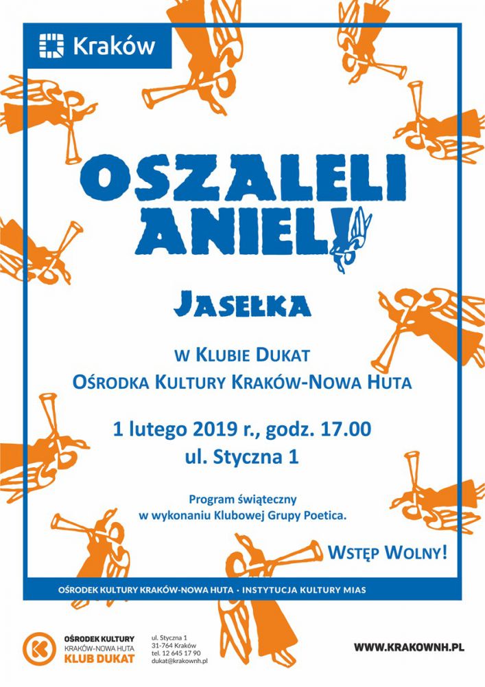 Klub Dukat Orodka Kultury Kraków-Nowa Huta (ul. Styczna 1) zaprasza 1 lutego o godz. 17.00 na jasełka. Czy aniołom zdarza się oszaleć i co z tego może wyniknšć? Czy pasterze mogš się lenić, a do tego spierać z królami? Kto podsuwa złe pomysły Herodowi? Odpowiedzi na te pytania poznajš widzowie widowiska Oszaleli Anieli. Coroczny jasełkowy występ Klubowej Grupy Poetica stanowi dobrš tradycję Klubu Dukat, a na jej straży stojš okoliczni mieszkańcy. W tegorocznej edycji, wieńczšcej okres bożonarodzeniowy, wystšpi 14 osób, a w obsadzie aktorskiej nie zabraknie niespodzianek. Brawurowa akcja, żywa narracja i barwne stroje to od lat znak firmowy dukatowych jasełek, na które goršco zapraszajš organizatorzy i artyci.