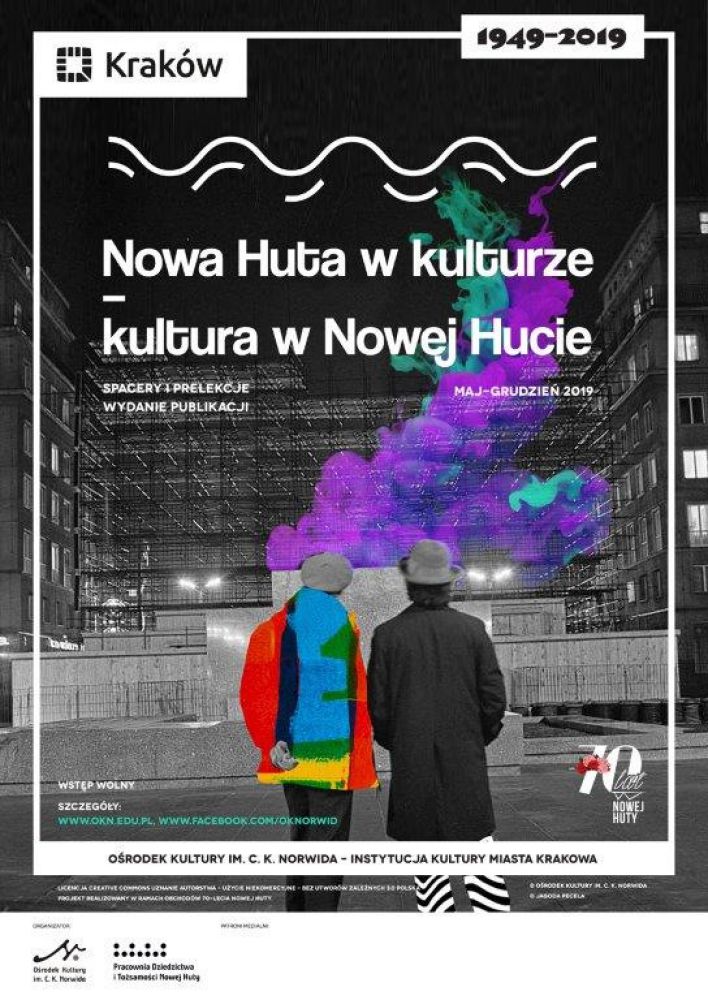 Nowa Huta w kulturze kultura w Nowej Hucie - cykl spacerów i prelekcji, podczas których będziemy opowiadać o dziedzinach kultury i sztuki w kontekcie Nowej Huty z perspektywy ich rodowisk i tekstów kultury. Na warsztat wemiemy: teatr; literaturę; film; fotografię; muzykę; sztuki plastyczne: malarstwo, rzebę, rysunek, grafikę; architekturę. Dzięki temu dowiemy się kto, co i jak tworzył w Nowej Hucie. Podsumowaniem realizowanych działań będzie bezpłatna recenzowana publikacja zbierajšca poruszane tematy. Projekt realizowany przez Pracownię Dziedzictwa i Tożsamoci Nowej Huty OKN w ramach obchodów 70-lecia Nowej Huty.