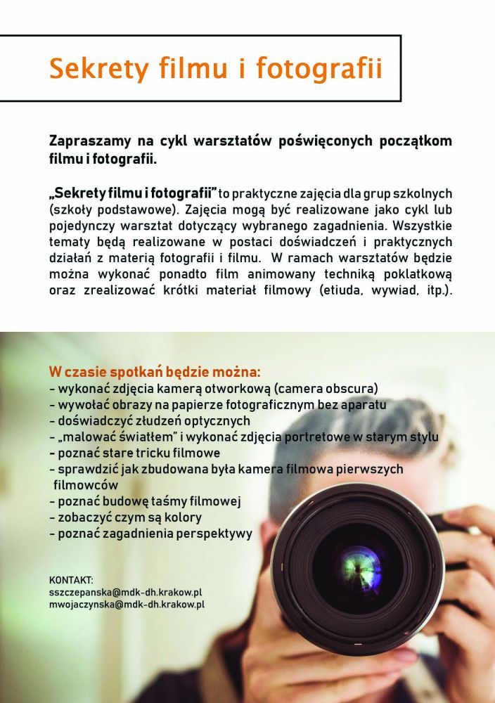 Sekrety filmu i fotografii to praktyczne zajęcia dla grup szkolnych (szkoły podstawowe). Zajęcia mogš być realizowane jako cykl lub pojedynczy warsztat dotyczšcy wybranego zagadnienia. Wszystkie tematy będš realizowane w postaci dowiadczeń i praktycznych działań z materiš fotografii i filmu.