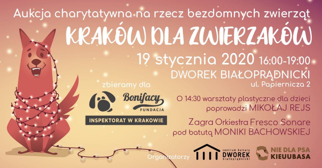 Koncert i aukcja Kraków Dla Zwierzaków" odbędš się w niedzielę 19 stycznia 2020 r. o godzinie 16:00 w Dworku Białopršdnickim przy ul. Papierniczej 2 w Krakowie.