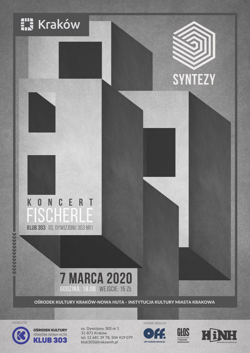 Klub 303 Orodka Kultury Kraków-Nowa Huta (os. Dywizjonu 303 nr 1) zaprasza na koncert Fischerle, który odbędzie się 7 marca 2020 r. o godzinie 18.00. Wydarzenie zainauguruje cykl artystyczny pod nazwš Syntezy. Projekt będzie miał charakter interdyscyplinarny, za punkt odniesienia i głównš o artystycznych działań przyjmujšc nowohuckie przestrzenie.