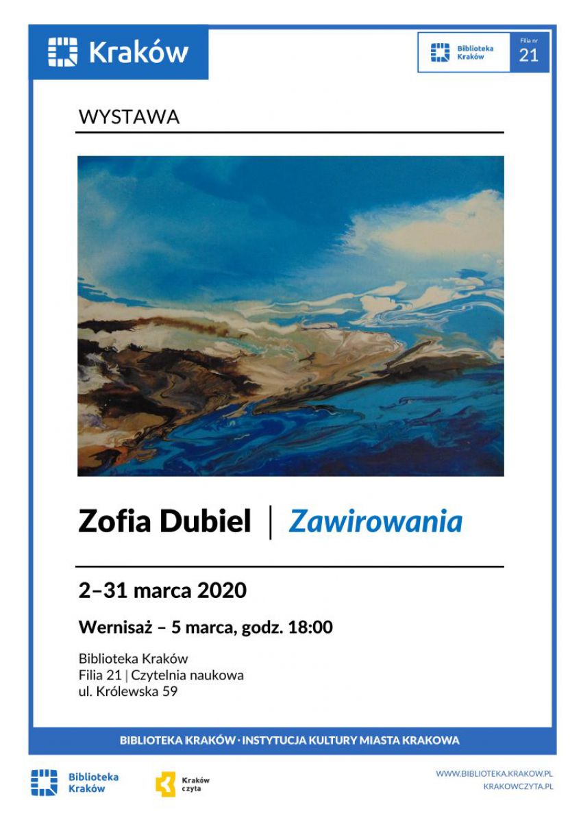 Wernisaż towarzyszšcy wystawie prac krakowskiej artystki Zofii Dubiel będzie okazjš do spotkania z malarkš oraz zapoznania się z jej twórczociš. Autorka wystawy Zawirowania opowie o swoich inspiracjach artystycznych, o procesie pracy twórczej i o stosowanych przez niš technikach malarskich.
