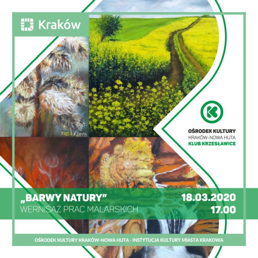 Klub Krzesławice Orodka Kultury Kraków-Nowa Huta (ul. M. Wańkowicza 17) zaprasza 18 marca o godz. 17.00 na wernisaż wystawy obrazów Barwy Natury. Surowa biel nieżnej zimy, wielokolorowy kobierzec kwitnšcych łšk wiosnš, soczysta zieleń i żółknšce łany zbóż latem, wrzosowy fiolet i deszcz spadajšcych lici w wietle jesiennego słońca wyobrania przyrody w malowaniu wiata barwami od zawsze inspirowała artystów, zwłaszcza malarzy. Klub Krzesławice zaprasza na powięconš barwom natury wystawę obrazów autorstwa członków Stowarzyszenia Plastyków Ziemi Krakowskiej. Wernisaż uwietni koncert muzyki klasycznej w wykonaniu duetu Carmello.