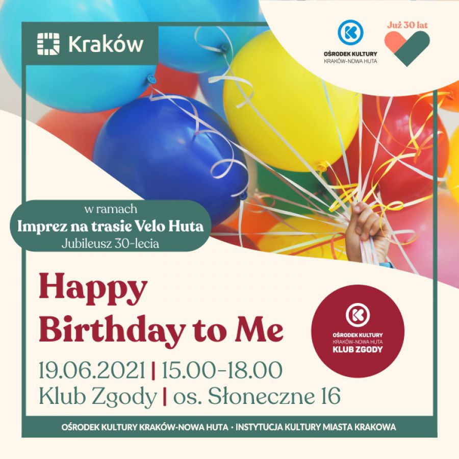 Z okazji Jubileuszu 30-lecia Orodka Kultury Kraków-Nowa Huta, Klub Zgody zaprasza na rodzinne wydarzenie Happy Birthday to Me. Na pełen atrakcji program złożš się m.in. warsztaty taneczne prowadzone przez instruktorkę̨ baletu Katarzynę Sojkę, warsztaty rękodzielnicze, mini konkursy plastyczne czy zagadkowe koło fortuny. Atrakcjš dla dzieci będš także liczne konkursy, zmywalne tatuaże oraz pokaz formowania balonów w najróżniejsze kształty. Będzie to czas więtowania w pełnej radoci i zabawy atmosferze. Podczas spotkania odbędzie się także finał konkursu Rodzina - nasza super moc oraz nastšpi otwarcie pokonkursowej wystawy zgłoszonych do konkursu prac plastycznych. Zapraszamy do wspólnego więtowania!
