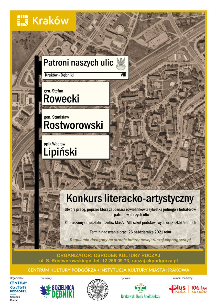 Orodek Kultury Ruczaj zaprasza do wzięcia udziału w konkursie literacko-artystycznym "Patroni naszych ulic" powięconym trzem bohaterom - gen. Stefanowi P. Roweckiemu, gen. Stanisławowi J.M. Rostworowskiemu i ppłk Wacławowi Lipińskiemu.