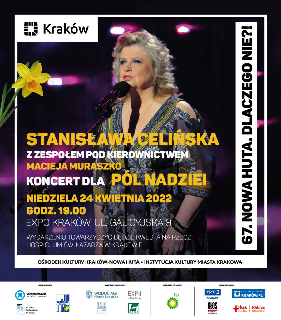 Wiosenne koncerty cyklu Nowa Huta. Dlaczego Nie?! powięcone sš zawsze Polom Nadziei akcji zbierania funduszy na rzecz polskich hospicjów, która została zainicjowana w Polsce przez krakowskie Towarzystwo Przyjaciół Chorych, prowadzšce w Nowej Hucie Hospicjum w. Łazarza. Podczas kwietniowego koncertu usłyszymy Stanisławę Celińskš - wszechstronnš aktorkę i utalentowanš wokalistkę wraz z zespołem pod kierownictwem Macieja Muraszko.