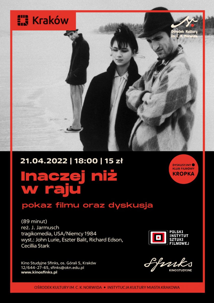 Dyskusyjny Klub Filmowy „Kropka” zaprasza o godz. 18:00 na film „Inaczej niż w raju” w reż. Jima Jarmuscha; po seansie zapraszamy na dyskusję.