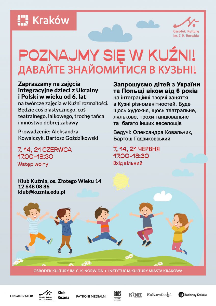 Zapraszamy dzieci z Ukrainy i Polski w wieku od 6 lat na twórcze zajęcia integracyjne w KuŸni rozmaitoœci. Będzie coœ plastycznego, coœ teatralnego, lalkowego, trochę tańca i mnóstwo dobrej zabawy.