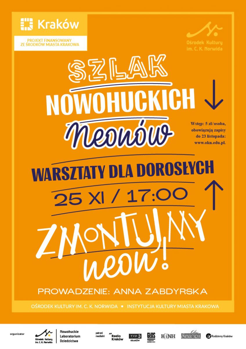 Warsztaty projektowania neonów dla dorosłych w ramach projektu „Szlak nowohuckich neonów”. Prowadzenie: dr Anna Zabdyrska. Projekt finansowany ze środków Miasta Krakowa.
