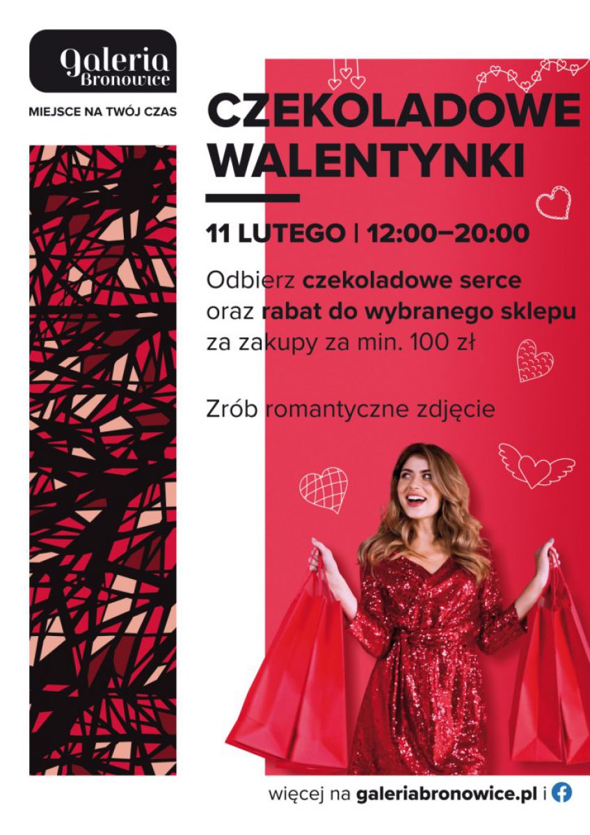 Tegoroczny Dzień Świętego Walentego klienci Galerii Bronowice spędzą w niezwykle słodkiej atmosferze. Centrum handlowe przygotowało bowiem dla swoich gości specjalną akcję, podczas której będzie można otrzymać drobne upominki. Odbędzie się ona 11 lutego, w godz. 12:00 - 20:00. Aby wziąć udział w Czekoladowych Walentynkach, wystarczy zrobić zakupy za min. 100 zł, a następnie okazać dowód zakupu oraz pobraną aplikację Galerii Bronowice. Klienci, którzy spełnią te warunki obdarowani zostaną czekoladowym sercem, a także bonem rabatowym do wybranego przez siebie sklepu.