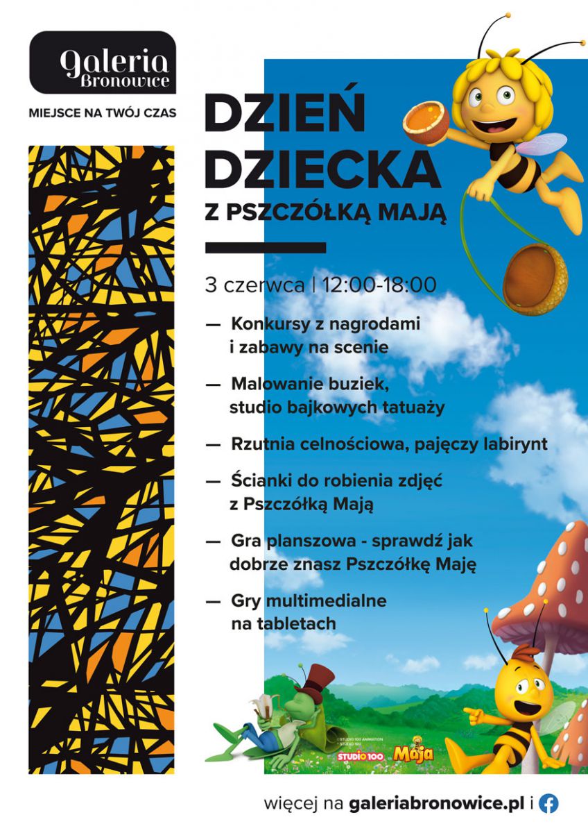 Międzynarodowy Dzień Dziecka to jedno z tych świąt w roku, na które najmłodsi czekają z niecierpliwością. Galeria Bronowice zadbała więc o to, aby podczas tegorocznych obchodów zapewnić maluchom moc niezapomnianych wrażeń. W ramach nadchodzącego wydarzenia zaplanowano liczne atrakcje, a potowarzyszy im jedna z najbardziej lubianych bajkowych postaci – ponadczasowa Pszczółka Maja. 3 czerwca, w godz. 12:00-18:00, dzieci będą mogły m.in. zajrzeć do studia bajkowych tatuaży, wziąć udział w malowaniu buziek czy grze planszowej, która powie jak dobrze znają bohaterkę dnia. Chętni sprawdzą też swoją sprawność rzucając „pyłkiem pszczelim”, pokonując tor przeszkód i pajęczy labirynt oraz biorąc udział w wyścigu na samochodzikach grawitacyjnych. Nie zabraknie również konkursów z nagrodami, gier multimedialnych, zabawy na scenie oraz możliwości zrobienia pamiątkowego zdjęcia na ściankach z Pszczółką Mają.