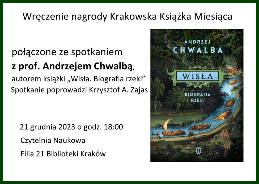 Wręczenie nagrody Krakowska Książka Miesiąca połączone ze spotkaniem z prof. Andrzejem Chwalbą – autorem książki „Wisła. Biografia rzeki”. O książce można przeczytać tak: „Nikt dotychczas tak nie opowiadał o Wiśle! Pionierskie, fascynujące dzieło, które zachwyci nie tylko fanów historii”. Spotkanie poprowadzi Krzysztof A. Zajas – przewodniczący jury.