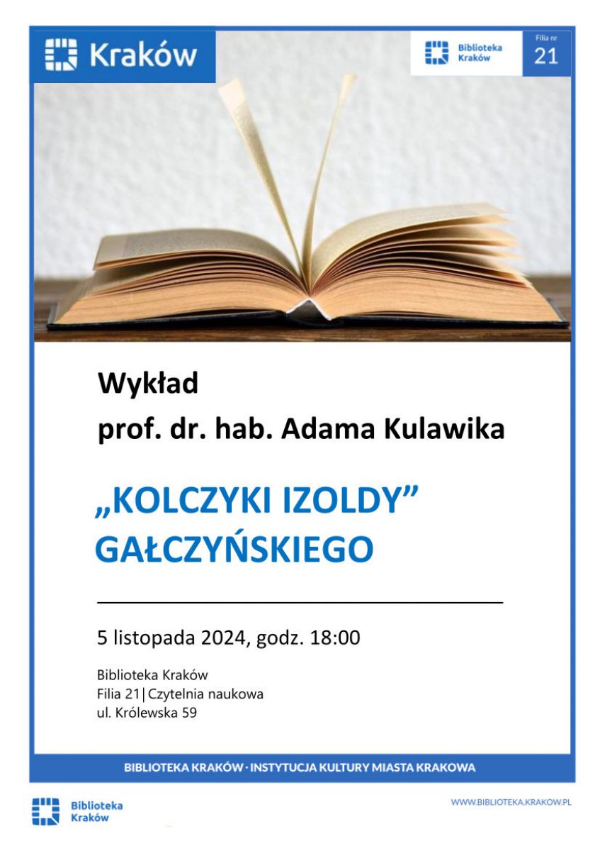 Spotkanie z prof. dr. hab. Adamem Kulawikiem, który poprowadzi wykład z dyskusją w kontekście obchodów upamiętniających Powstanie Warszawskie. Spotkanie przygotowane na podstawie utworu Konstantego Ildefonsa Gałczyńskiego Kolczyki Izoldy.