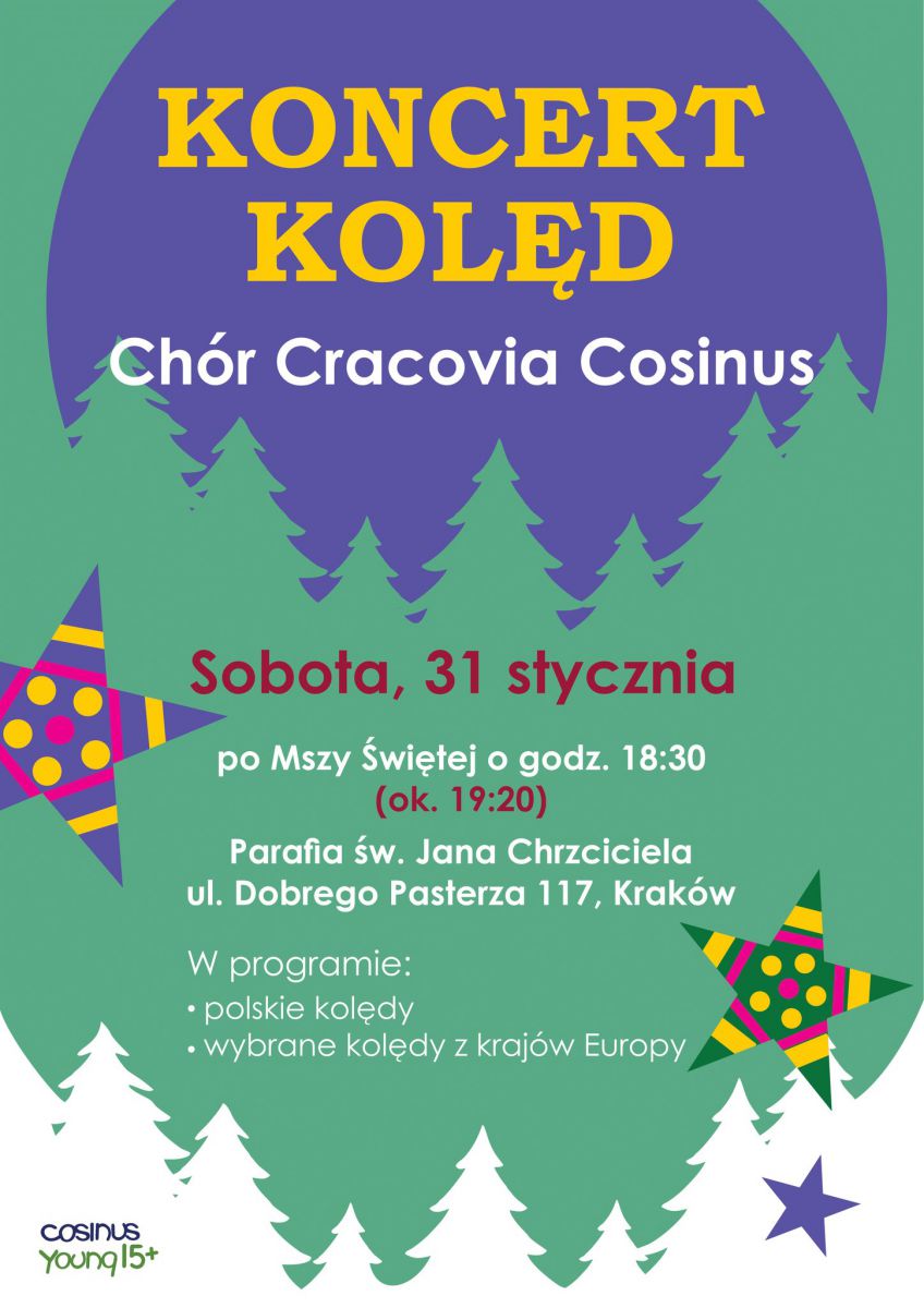 Szkoły CosinusYoung 15+ serdecznie zapraszają na wyjątkowy koncert kolęd w wykonaniu Chóru Cracovia Cosinus, który odbędzie się w sobotę, 31 stycznia 2026 r., bezpośrednio po Mszy Świętej o godz. 18.30 w Kościele parafii św. Jana Chrzciciela przy ul. Dobrego Pasterza 117 w Krakowie.