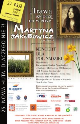 Porozumienie Dzielnic Nowohuckich - Dzielnice: XIV Czyżyny, XVI Bieńczyce, XVII Wzgórza Krzesławickie, Oœrodek Kultury Kraków-Nowa Huta, Dzielnica XVIII Nowa Huta zapraszajš do Teatru ŁaŸnia Nowa na koncert dedykowany Polom Nadziei. Na 25 koncercie z cyklu Nowa Huta. Dlaczego Nie?! wystšpi Martyna Jakubowicz z zespołem.