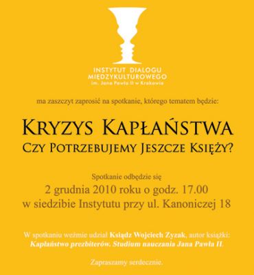 Odbędzie się ono 2 grudnia 2010 o godzinie 17:00, w siedzibie Instytutu przy ulicy Kanoniczej 18. Temat naszej dyskusji nawišzuje do ksišżki: Kapłaństwo prezbiterów. Studium nauczania Jana Pawła II. W spotkaniu wemie udział Ksišdz Wojciech Zyzak, autor ksišżki. W swej monografii ksišdz Zyzak omówił szeroko takie tematy jak: tożsamoć prezbitera, Bóg jako ródło kapłaństwa, miejsce i rola prezbitera we wspólnocie Kocioła, misja kapłana, jego duchowoć i formacja. Można powiedzieć, że jest to jak dotšd najbardziej ródłowe, obszerne i wyczerpujšce studium tematu kapłaństwa w nauczaniu Ojca więtego. Ksišżka ta stanowi jednoczenie przystępny i wieloaspektowy podręcznik duchowoci kapłańskiej, który winien znaleć się przede wszystkim w bibliotece każdego prezbitera.