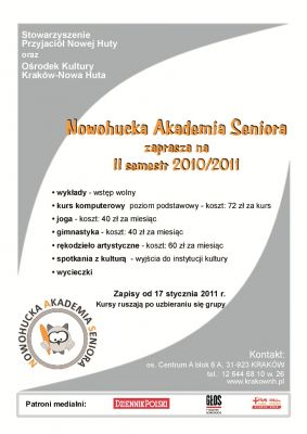 W drugiej połowie lutego rozpoczyna się kolejny semestr nauki w Nowohuckiej Akademii Seniora. Na ten okres przygotowalimy zarówno nowe propozycje, jak również kontynuację dotychczasowych kursów, cieszšcych się niesłabnšcym zainteresowaniem w rodowisku krakowskich seniorów.