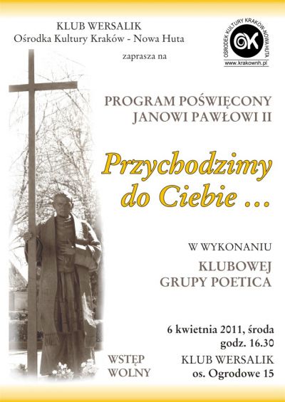 Zapraszamy do Klubu Wersalik Oœrodka Kultury Kraków-Nowa Huta na spotkanie poœwięcone osobie Jana Pawła II, podczas którego wystšpi Klubowa Grupa Poetica z Klubu Dukat Oœrodka Kultury Kraków – Nowa Huta z programem artystycznym o Ojcu Œwiętym.