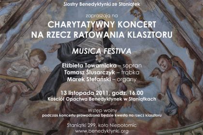 w tym roku koncert charytatywny na rzecz Klasztoru Sióstr Benedyktynek w Staništkach. Tym razem zabrzmiš najpiękniejsze arie wokalne oraz pełne blasku utwory na tršbkę i organy, w mistrzowskim wykonaniu Elżbiety Towarnickiej sopran, Tomasza lusarczyka tršbka oraz Marka Stefańskiego organy. Podczas koncertu zbierane będš datki na ratowanie bezcennego zabytku historii i architektury, jakim jest staništecki klasztor. Ponadto Siostry będš sprzedawały swoje wyroby, spożywcze produkowane według dawnych, sprawdzonych receptur (miód, ciastka).