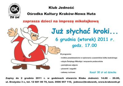 Impreza mikołajkowa w Klubie Jednoœć Oœrodka Kultury Kraków-Nowa Huta dla wszystkich grzecznych dzieci, które wierzš w Œwiętego Mikołaja. W programie: przedstawienie w wykonaniu dzieci z kółka teatralnego, wspólne zabawy ruchowe, piosenki o choince i zimie, a na koniec wizyta zacnego Goœcia, który rozda podarunki i będzie pozował z dziećmi do pamištkowych zdjęć. Zapisy na imprezę odbywać się będš w klubie do 2 grudnia.