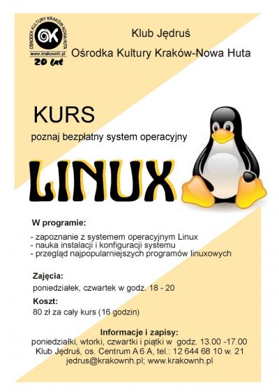 Klub Jędru Orodka Kultury Kraków-Nowa Huta (os. Centrum A 6a) zaprasza na kurs systemu operacyjnego Linux.