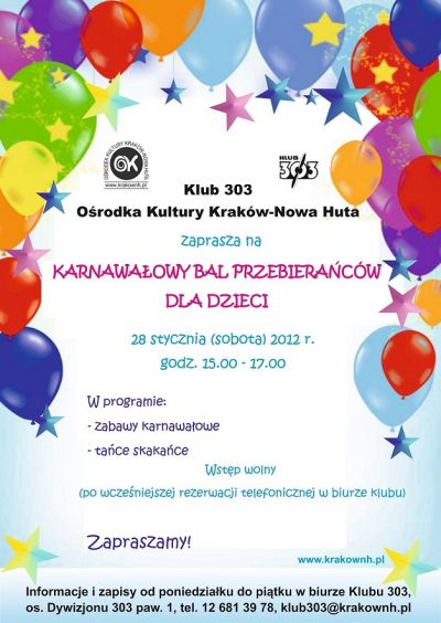 Klub 303 Oœrodka Kultury Kraków-Nowa Huta (os. Dywizjonu 303 1) zaprasza 28 stycznia (sobota) 2012 o godz. 15.00 na imprezę tanecznš.