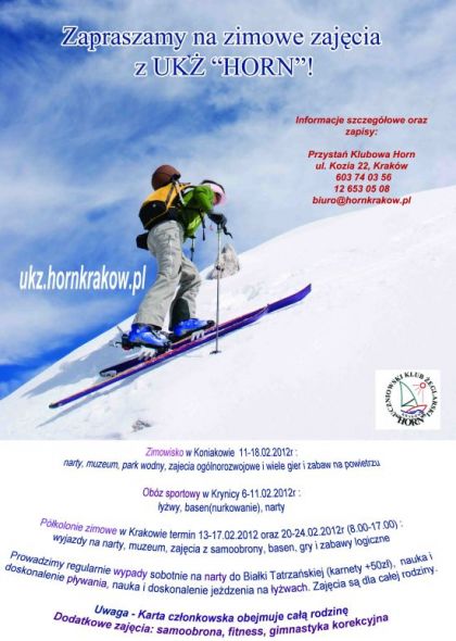 W programie turnusu: 2 wyjazdy na narty, wyjœcie na pływalnię, gimnastyka korekcyjna, nauka szybkiego czytania, zabawy terenowe, gry logiczne i integracyjne, specjalnie zaplanowane zajęcia warsztatowe. Codziennie zapewniamy dzieciom 2 posiłki: II œniadanie i obiad, a w przypadku wyjazdów na narty – suchy prowiant. Dziećmi opiekować się będš wykwalifikowani opiekunowie i instruktorzy narciarstwa.