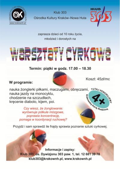 Czy wiesz, że żonglowanie: wyrównuje półkule mózgowe, poprawia koncentrację, pomaga w koordynacji ruchowej? Przyjd do Klubu 303 Orodka Kultury Kraków-Nowa Huta i sam sprawd ile frajdy sprawia poznanie sztuki cyrkowej. Zapraszamy zarówno dzieci od 10 roku życia jak i mł...odzież oraz dorosłych.