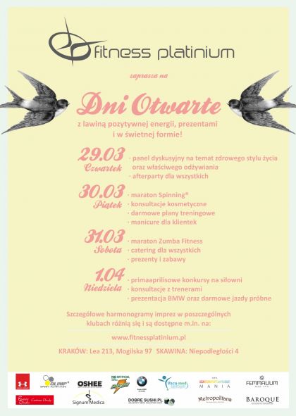 Jeszcze nie opucił Cię zimowy marazm? A Twoje koci le znoszš nawet najkrótszy spacer? Czas na wiosenny rozruch! W dniach 30, 31 marca oraz 1 kwietnia Platinium Fitness zorganizuje specjalnie dla Was Dni Otwarte w swoich siedzibach przy Mogilskiej, Lea i Niepodległoci w Skawinie.
