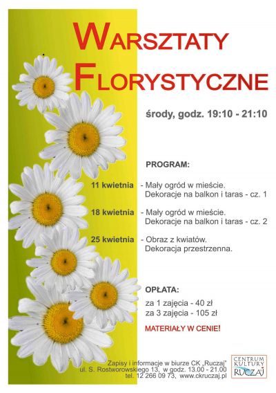 Centrum Kultury "Ruczaj" zaprasza na kolejny cykl warsztatów florystycznych. Tematy zajęć w kwietniu powięcone sš dużym formom florystycznym.
