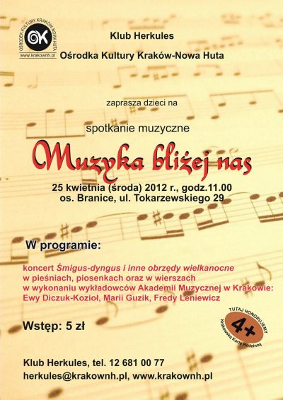 Klub Herkules Oœrodka Kultury Kraków-Nowa Huta (ul. Tokarzewskiego 29) zaprasza na kolejne spotkanie muzyczne dla dzieci, które odbędzie się 25 kwietnia 2012 r. o godz. 11.00.