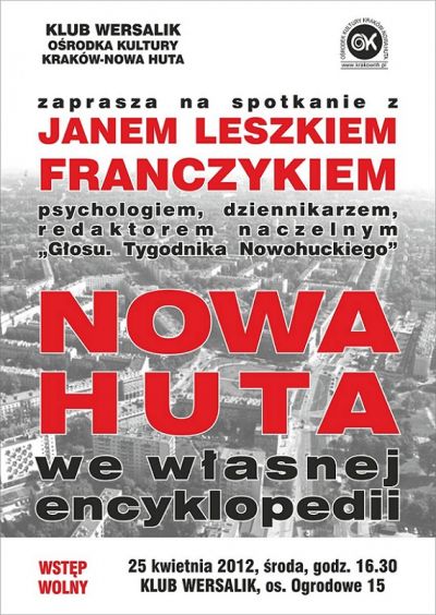 Klub Wersalik Oœrodka Kultury Kraków-Nowa Huta (os. Ogrodowe 15) zaprasza na spotkanie z Janem Franczykiem – autorem Encyklopedii Nowej Huty, które odbędzie się 25 kwietnia 2012 r. (œroda) o godz. 16.30 w Klubie.
