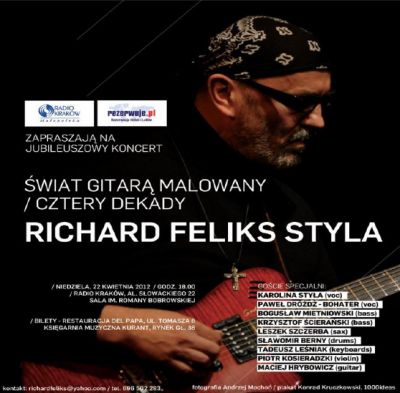 W niedzielę 22 kwietnia o godz. 18.00 w Studiu im. Romany Bobrowskiej (Radio Kraków) odbędzie się jubileuszowy koncert Ryszarda Styły „Œwiat gitarš malowany/cztery dekady”. Muzyk zagra swoje najbardziej znane kompozycje prezentowane już od ponad 30 lat na krakowskiej scenie jazzowej. Finał koncertu – prawdziwa wisienka na torcie: wykonanie premierowego utworu Ryszarda Styły – zagrajš zaproszeni muzycy: Karolina Styła (popularna wokalistka to prywatnie córka gitarzysty) Paweł Dróżdż, Bogusław Mietnikowski, Krzysztof Œcierański, Leszek Szczerba, Sławomir Berny, Tadeusz Leœniak, Piotr Kosieradzki i Maciej Hrybowicz.