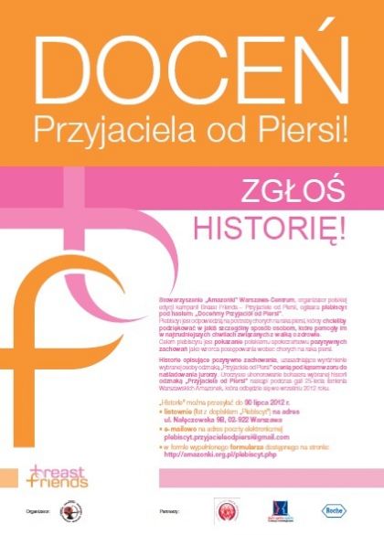 Stowarzyszenie Amazonki Warszawa-Centrum, organizator polskiej edycji kampanii Breast Friends Przyjaciele od Piersi, ogłasza Plebiscyt pod hasłem: Doceńmy Przyjaciół od Piersi. Plebiscyt jest odpowiedziš na potrzeby chorych na raka piersi, którzy chcieliby podziękować w jaki szczególny sposób osobom, które pomogły im w najtrudniejszych chwilach zwišzanych z walkš o zdrowie. Celem Plebiscytu jest pokazanie polskiemu społeczeństwu pozytywnych zachowań, jako wzorca postępowania wobec chorych na raka piersi.