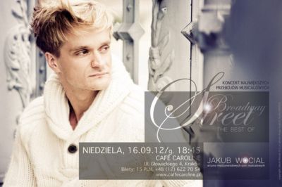 16 wrzenia o godzinie 18:45 w krakowskiej Café Caroline wystčpi Jakub Wocial z własnym Recitalem BROADWAY STREET - THE BEST OF. Usłyszeæ bêdzie można absolutne hity amerykańskiego musicalu. MY FAIR LADY, GYPSY, NEW YORK, NEW YORK, JESUS CHRIST SUPERSTAR, LES MISÉRABLES, THE PHANTOM OF THE OPERA, CATCH ME IF YOU CAN to tylko niektóre z tytułów, które zabrzmič zaraz po wakacjach.