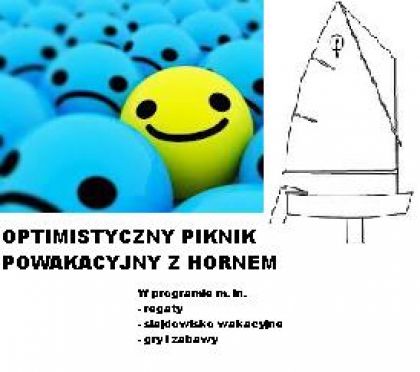 Zapraszamy wszystkie dzieci, które uczestniczyły w naszych półkoloniach "Optimistyczna przygoda z Hornem" oraz wszystkich, którzy sš zainteresowani żeglowaniem w naszym klubie. W programie przewidujemy wspominanie miłych chwil z półkolonii, prezentację naszej szkółki żeglarskiej i kadry trenerskiej, mini regaty dla chętnych dzieci oraz atrakcyjne gry i zabawy na brzegu dla całych rodzin. ZAPRASZAMY!