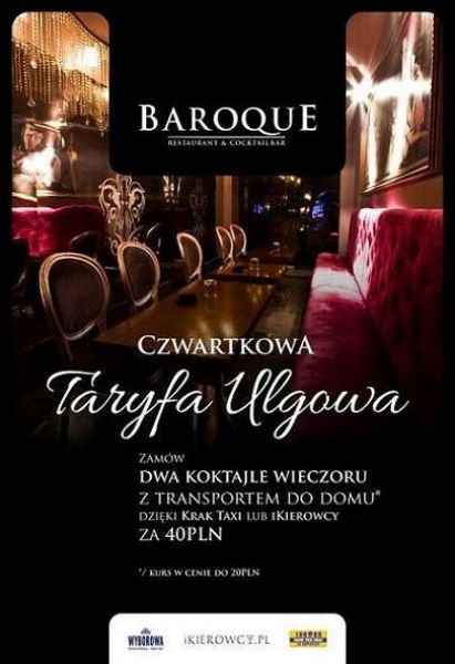Masz ochotę na dobrego drinka po pracy lub spędzenie miłego wieczoru ze znajomymi i nie martwić się o powrót do domu? Jeżeli nasuwa Ci się odpowied "TAK!" to Baroque Club przygotował idealne rozwišzanie! W każdy czwartek, za 40 PLN otrzymasz 2 wymienite koktajle oraz transport do domu!