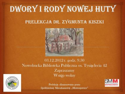 Nowohucka Biblioteka Publiczna w Krakowie i Spdzielnia Mieszkaniowa "Mistrzejowice" zapraszaj na prelekcj dr. Kazimierza Kiszki, ktry bardzo interesujco bdzie opowiada o rodach ziemiaskich Nowej Huty.