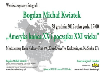 Wystawa „Ameryka końca XX i poczštku XXI wieku” prezentuje zdjęcia Bogdana Michała Kwiatka zrobione podczas podróży do Ameryki Północnej. Tematem wystawy sš w szczególnoœci Stany Zjednoczone oraz Kanada (miasta, parki narodowe, ludzie i krajobrazy) w dwóch okresach czasowych. Relacja fotograficzna prezentowana przez autora przedstawia Amerykę z lat 90-tych XX wieku oraz podobne miejsca 20 lat póŸniej. Fotografie pochodzš z cyklu 13 wystaw pt. „5 lat w 2 lata- czyli podróż dookoła œwiata” jakš autor odbył w latach 1992-95 w tzw. 500-tnš rocznice „Odkrycia Ameryki”. Wystawie zdjęć towarzyszyć będzie prezentacja ksišżek autora pt: „5 lat w 2 lata”,