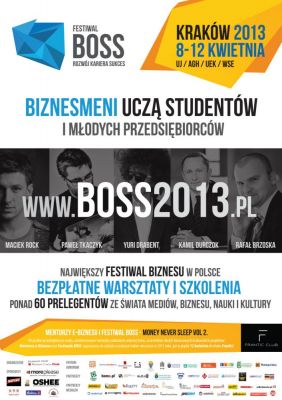 8 - 12 kwietnia w aulach największych krakowskich uczelni rusza X edycja Festiwalu BOSS. Podczas krakowskiej odsłony zobaczycie liderów polskiego biznesu - między innymi Rafała Brzoskę, Janusza Steinhoffa czy Zbigniewa Wróbla. Trenerów - Macieja Bennewicza, Bartosza Skwarczka oraz mistrzów polskiego marketingu - Pawła Tkaczyka, Dawida Szczepaniaka i Yuriego Drabenta. Na Festiwalu BOSS wystąpią również znani prezenterzy telewizyjni: Kamil Durczok i Maciek Rock. Lista prelegentów dostępna jest na www.boss2013.pl.