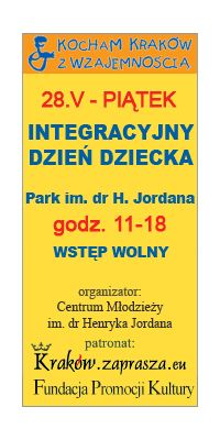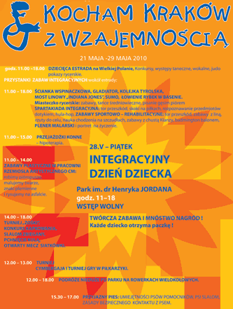 11.00 – otwarcie z udziałem pełnomocnika prezydenta Krakowa, Bogdana Dąsala; 11.10 – zespół taneczny Gwiazdy; 11.25 – konkursy dla dzieci prowadzi Pracownia Aktywności Twórczej Centrum Młodzieży; zapowiedź turnieju cymbergaja i gry w piłkarzy ki; 12.00 – pokaz tańców dworskich Fundacji Polonia Celeberrima; 12.15 – konkursy dla dzieci; 12.30 – pokaz gimnastyki sportowej i taniec towarzyski w wykonaniu zespołu ze Szkoły Podstawowej nr 5; zapowiedź turnieju rodzin i przyjaciół; 12.50- zespół taneczny „Aslan” z SOSW nr 1; 13.05- prezentacja tomiku wierszy dziecięcych o Krakowie z udziałem młodych autorów i laureatów konkursu poetyckiego;13.15 – rozstrzygnięcie turnieju rodzin przed sceną, wywiady, nagrody :-) 13.30 – pokaz umiejętności Klubu Judo Yamabushi z Zakopanego; 13.50 – zespół tańca współczesnego Agitatus z Centrum Młodzieży; 14.10 – solistka chóru Fuzja GCM; 14.15 – pokaz gry na gitarze klasycznej, Centrum Młodzieży; 14.30 – zespół wokalny Voce Centrum Młodzieży; 15.00 – laureaci Małopolskiego Konkursu Gry na Keyboardzie „Piano Beat”; 15.30 – zapowiedź turnieju „zośki” i otwartego meczu siatkówki, występ Studia Ruchu i Piosenki „Nutki” z Centrum Młodzieży oraz laureatów Wojewódzkiego Konkursu Piosenki „Przedszkolaki śpiewają”; 16.15 – przedstawienie „Znaki Czasu” zespołu Tęcza; 16.45: pokaz pojedynku rycerskiego- Fundacja Polonia Celeberrima; 17.00: zespół taneczny Dzieci Krakowa z MDK „Dom Harcerza”