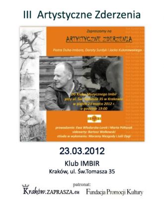 Tym razem zderzymy trzy interesujące osobowości twórcze : Dorotę Surdyk i Jacka Kukorowskiego (poetów) oraz Piotra Duha – Imbora (grafika). Gościnnie wystąpią Marzena Niezgoda z Julią Dyga, które zaprezentują etiudę pantomimiczną pt. "Kolory", inspirowaną twórczością Urszuli Kozioł.
