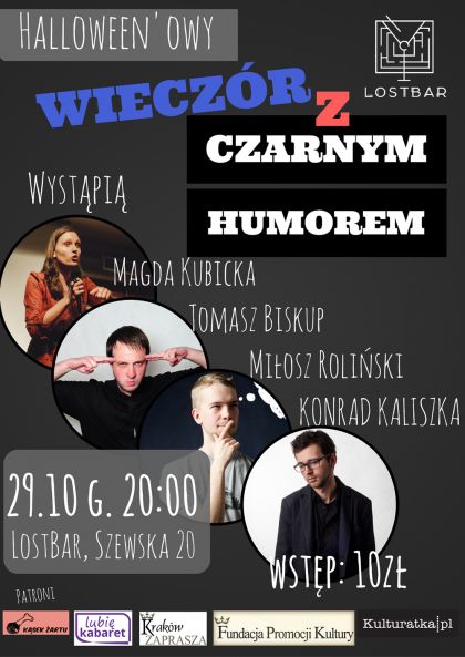 Na Halloween mamy dla Was coś wyjątkowego. Zapraszamy 29 października na Wieczór z Czarnym Humorem! Wystąpi czworo krakowskich komików, którzy zaprezentują Wam swoje specyficzne poczucie humoru.