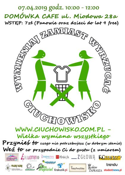 Kolejna edycja szalonej wymiany ubrań i dodatków czyli Krakowskiego Ciuchowiska już 7 kwietnia. Widzimy się ponownie na Kazimierzu w Domówka Cafe (ul.Miodowa 28a). Tym razem tak jak ostatnio wymiana odbywać się będzie w całym lokalu (stąd też inna cena). Nie będzie możliwości oczekiwać w środku więc jeśli nie chcecie marznąć to proszę być na 10:00 :)