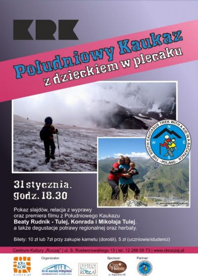 Zapraszamy na spotkanie z rodziną Tulejów, realizującą autorski projekt podróżniczo - wspinaczkowy "Z dzieckiem w plecaku", w ramach którego wraz z synem Mikołajem przemierzają świat i zdobywają najwyższe szczyty Kaukazu, co roku zapuszczając się coraz dalej i coraz wyżej. Śpią w namiocie, podróżują jak najtaniej lokalnymi środkami transportu, a także sami organizują sobie wyżywienie.
