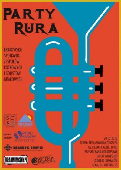 Staromiejskie Centrum Kultury Młodzieży zaprasza do udziału w Krakowskich Spotkaniach Zespołów Rockowych i Solistów Gitarowych PARTY RURA, które odbędą się 2 marca 2013 na scenie SCKM ul. Wietora 15.