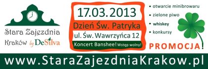 W niedzielę 17 marca br. o godz. 17:00 w Starej Zajezdni Kraków by DeSilva przy ul. Św. Wawrzyńca 12 startuje prawdopodobnie najbardziej irlandzka impreza na Kazimierzu. To właśnie tutaj w wielkiej hali z 1913 roku obchodzony będzie hucznie Dzień Świętego Patryka połączony z oficjalną premierą warzonego na miejscu piwa! Wieczorem koncert zespołu pieśni Irlandzkiej Banshee. Wstęp wolny!