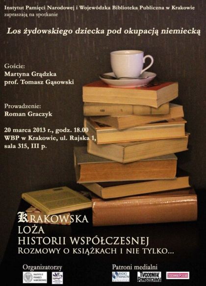 Instytut Pamięci Narodowej oraz Wojewódzka Biblioteka Publiczna w Krakowie zapraszają na spotkanie Los żydowskiego dziecka pod okupacją niemiecką. W dyskusji weźmie udział Martyna Grądzka oraz prof. Tomasz Gąsowski. Spotkanie poprowadzi Roman Graczyk.