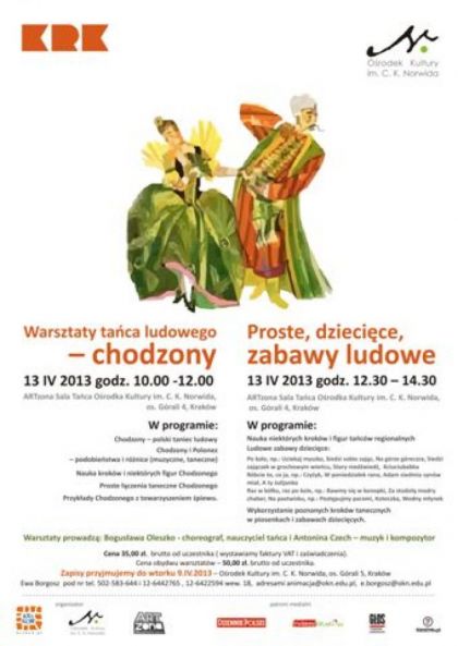 Cena obydwu warsztatów – chodzonego i dziecięcych zabaw ludowych (również 13 IV) - 50,00 zł. brutto od uczestnika . Serdecznie zapraszamy.
